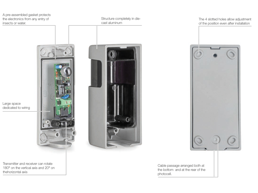 Cable passage arranged both at the bottom and at the rear of the photocell. Large space dedicated to wiring.