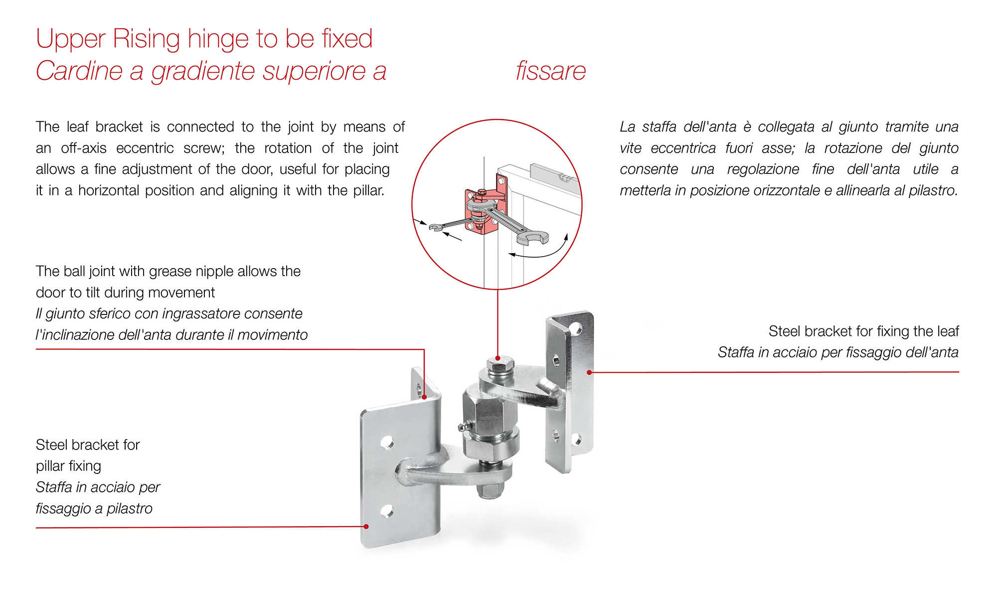 Opening system for swing gates with inclined leaves. To fix on the door and to fix on the pillar