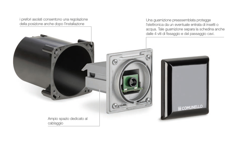 Passaggio cavi predisposto sia nella parte inferiore che nella parte posteriore della fotocellula. Ampio spazio dedicato al cablaggio