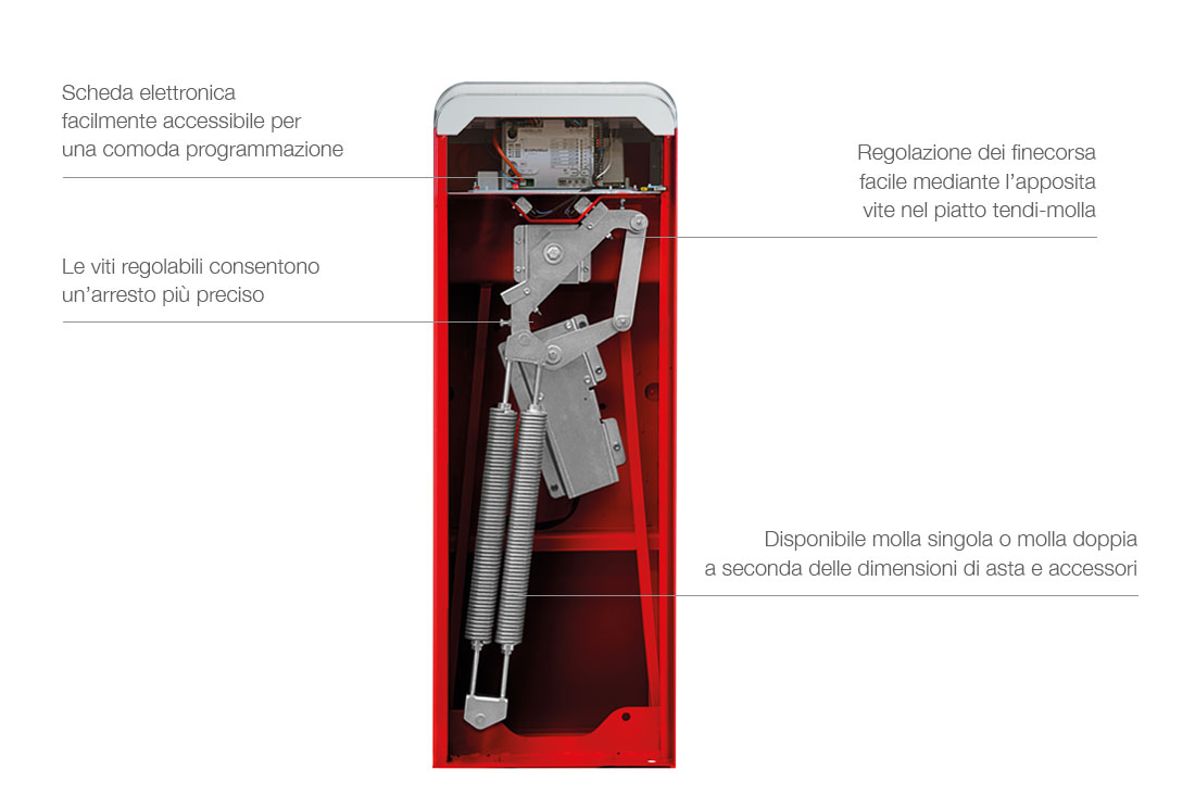 La programmazione è facilitata grazie ai finecorsa ed encoder integrati. E’ disponibile una versione opzionale con lampeggiante integrato.