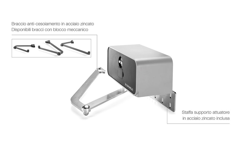 Compatibile con tutte le centrali di comando Comunello, Condor 500 è dotato di doppio finecorsa sia in apertura che in chiusura. Disponibili numerosi bracci articolati.