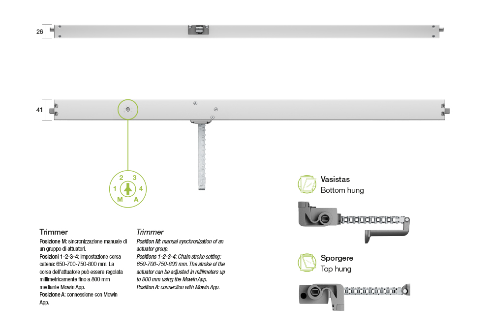 The new Wi-Fi technology, in addition to giving the possibility of making very precise adjustments using the Mowin App, allows synchronization of up to 8 LIWIN L40 Slim for the possible installation of several actuators in a single window or on systems where an elevated force is required.