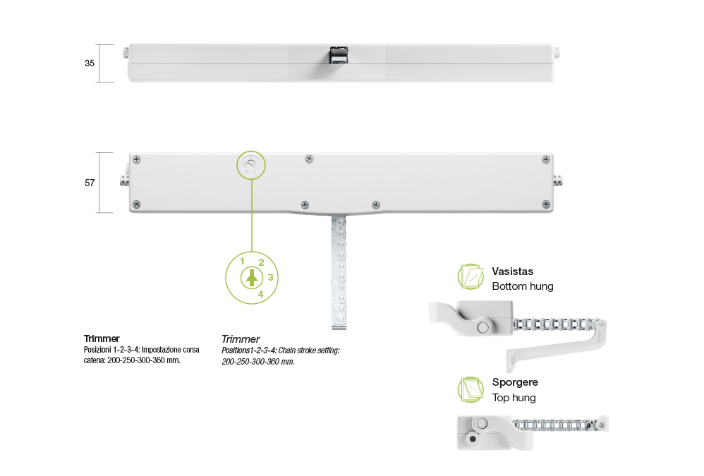 6 chain stroke lengths easily adjustable by trimmer even when the actuator is not powered.